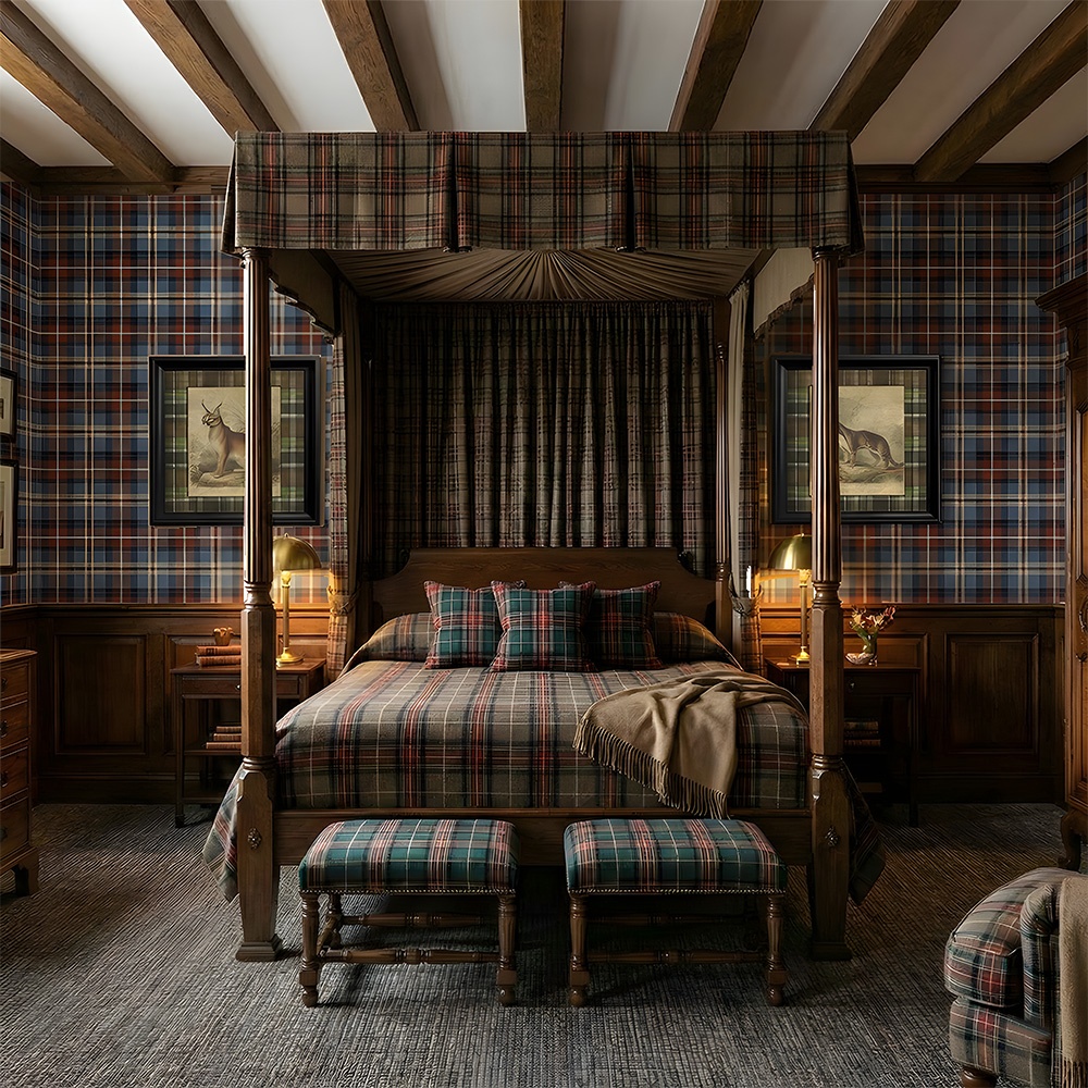 - Master-Suite-Schlafzimmer: Wie die Einrichtungsbilder zeigen, entfaltet die Tapetee „Inveraray“ ihre ganze Wirkung in einem Hauptschlafzimmer mit historischen Anklängen. In Kombination mit einem Himmelbett aus Massivholz und sichtbaren Deckenbalken verwandelt sie den Raum in ein persönliches Refugium und fängt die Atmosphäre eines schottischen Herrenhauses ein.